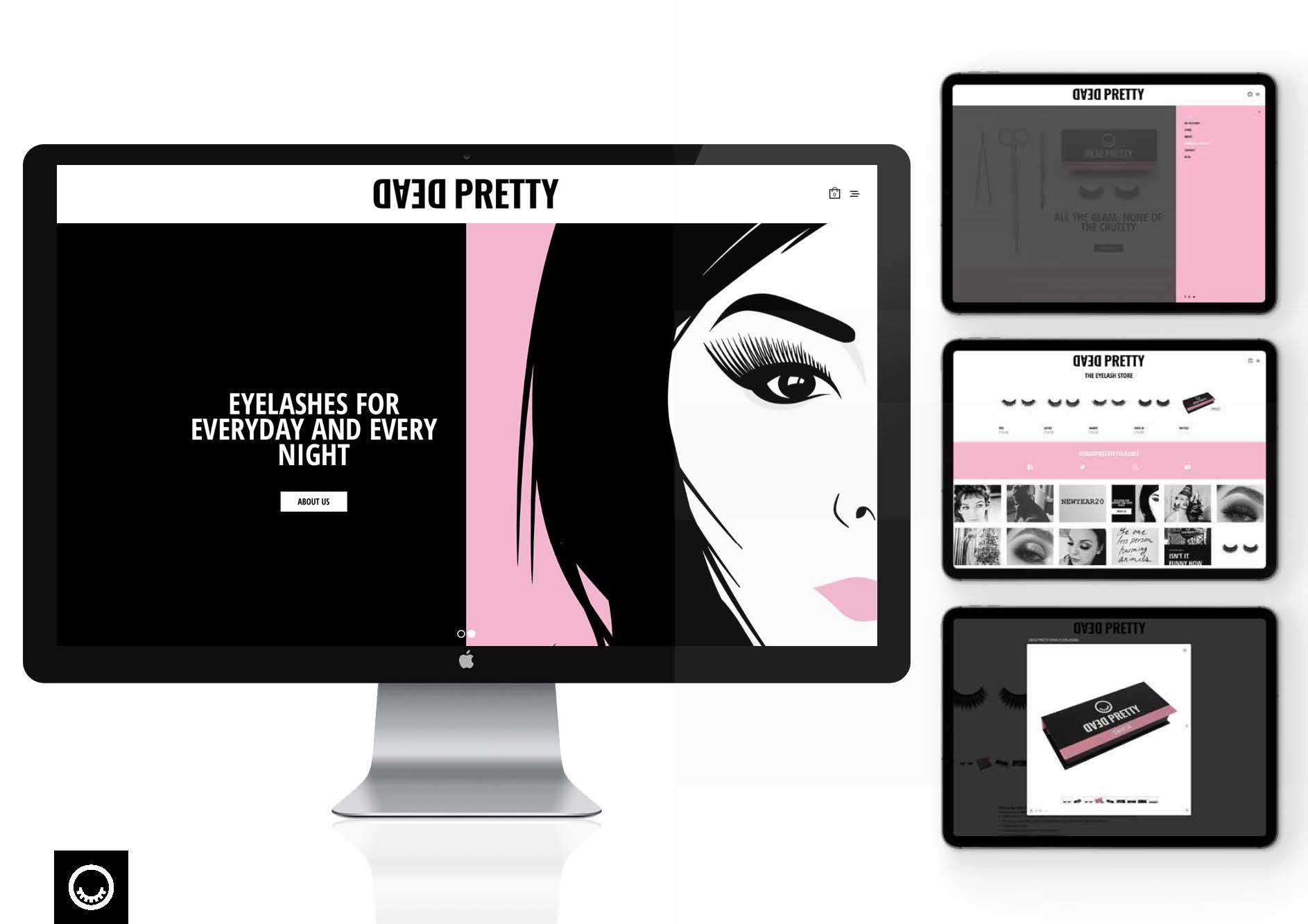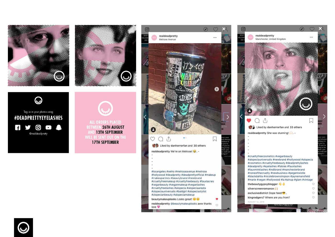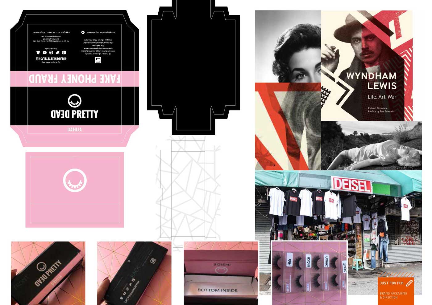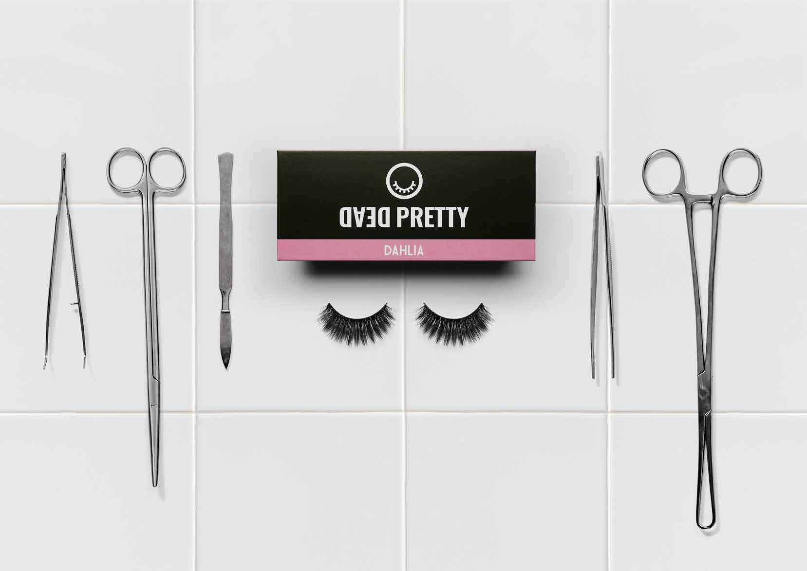 Creation of dark tourism style old hollywood eyelash brand, website, packaging and supporting graphics.